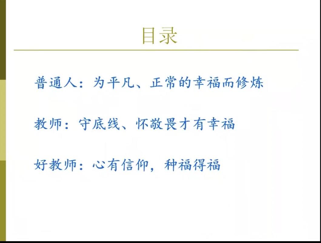 第三点从教师的价值观和原则出发结合生动例子,分别从于人,于国,于己三个角度解析好教师:心有信仰,种福得福。王晓飞提出教师为党和国家育人育才是教师的使命,教师要做员工生命中的贵人,为员工的终生发展和幸福奠基,唤醒员工巨大的潜能,激励员工成为更好的自己,向善向美的发展,对于教师自身而言,享受教育,方可爱返福至。