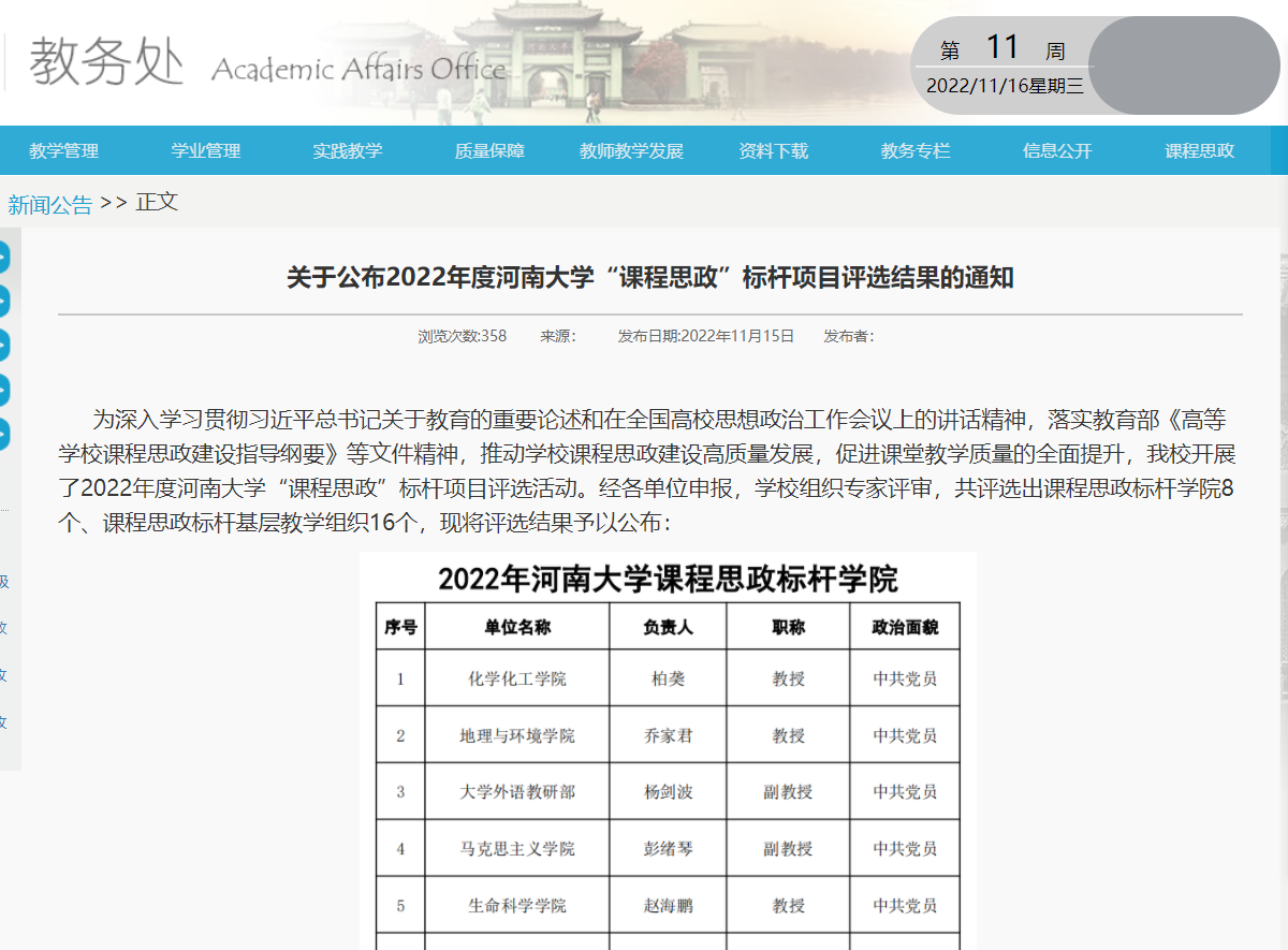 近日,学校公布了2022年度必赢242net官网“课程思政”标杆项目评选结果(https://jwc.henu.edu.cn/info/2145/7897.htm),公司获批必赢242net官网“课程思政”标杆学院,物理化学教研室获批必赢242net官网“课程思政”标杆基层组织。