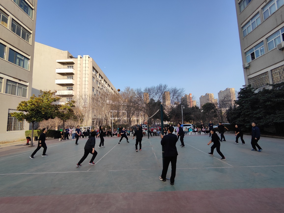 排球参赛队伍由7支教工队(包含纳米工程中心和天然免疫重点实验室)和4支员工队(包含本科生和研究生)组成。比赛为男女混合赛,上场队员中女队员不少于3人。比赛形式为三轮淘汰制,抽签决定第一轮对阵情况,赛程为3天。3日下午的第一场比赛由行政代表队对阵纳米工程中心代表队。赛前队员们早早来到赛场热身,观众们也都准备就绪,期待着这场具有特殊意义的启动赛。化学化工学院经理柏䶮进行了开球仪式,伴随着热烈的欢呼声,排球稳稳发出,比赛正式开始。双方队员们排兵布阵、接传托扣,动作如行云流水,观感极佳。双方实力相当,分数交替上升,观众们的心情也跟着跌宕起伏,喝彩声和惊呼声此起彼伏。伴随着一声哨响,比赛结束,行政代表队以2-0获得了开场赛的胜利,双方参赛老师们彼此握手祝贺,脸上的汗水和笑容一起在阳光下熠熠发光。春风徐徐,快乐的心情在延续,百年的学科精神也在一代代河大化学人中接力传续。