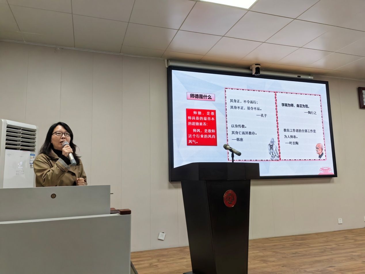 赵炎以“树良好师德师风 做必赢242net官网好老师”为主题,围绕“师德师风的重要性、师德师风警示案例通报、高校师德师风规范要求、做什么样的好老师”四个方面进行讲解。同时,她结合工作实际,分析了当前师德师风建设面临的新形势和新挑战,阐述了新时代教师肩负的新使命。赵炎表示,教师不仅要具备扎实的专业知识和教学技能,还要具备高尚的道德品质和行为规范。她希望全体教职工要牢记自己的职责和使命,树立正确的教育理念,不断提高自身素质,努力做具有教育家精神的新时代好老师。