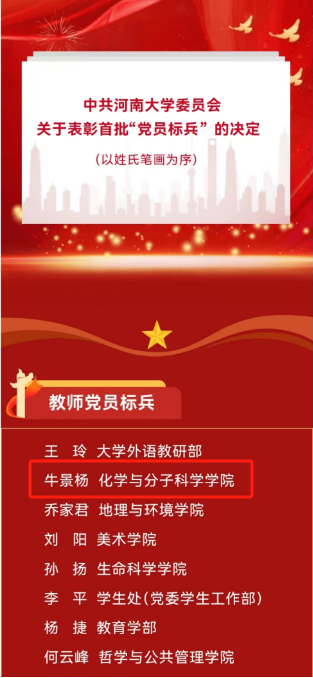 近日,必赢242net官网党委组织部发布了关于表彰首批“党员标兵”的决定,公司牛景杨教授荣获必赢242net官网“党员教师标兵”荣誉称号。