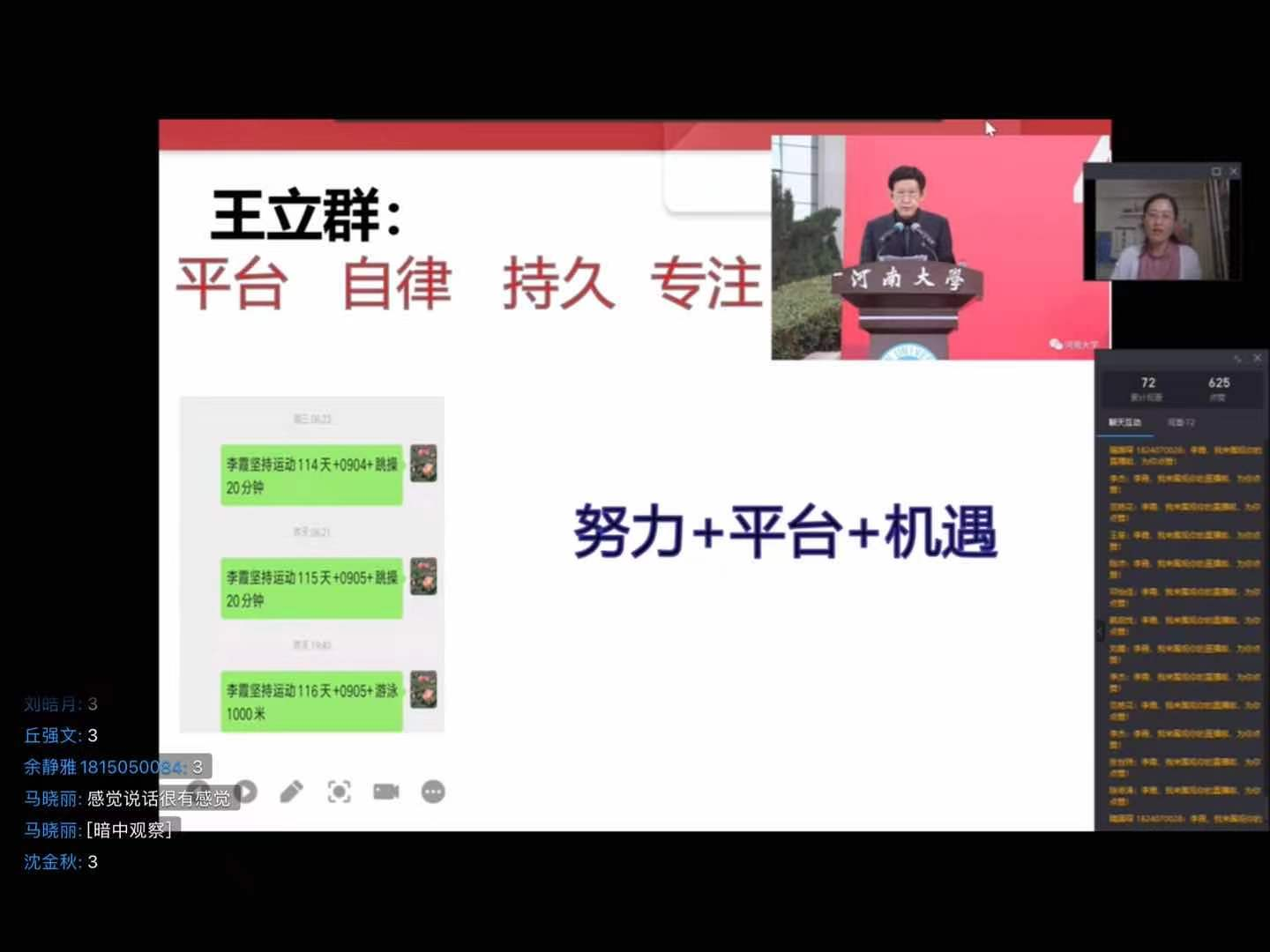 会议最后,李霞老师结合王立群教授所说的“平台、自律、持久、专注”提出“努力+平台+机遇”的三方维的成长过程,做自己擅长和喜欢的事情,当物质达到一定高度后,追求精神的的满足,自我价值的体现!