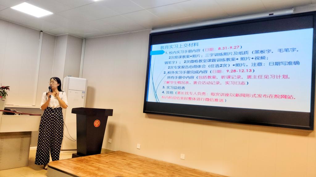 随后,她为同学们详细讲解了教育实习的具体安排。本次教育实习分为实习准备、校内实习、进点实习和实习总结四个阶段。其中校内实习包括课题讲授、三字训练、微格教室录课及专家讲座;进点实习包括市内实习及中牟县实习。在实习要求方面,她明确了纪律及奖惩措施,并多次提醒同学们以照片或视频等方式记录实习内容,保留实习材料。