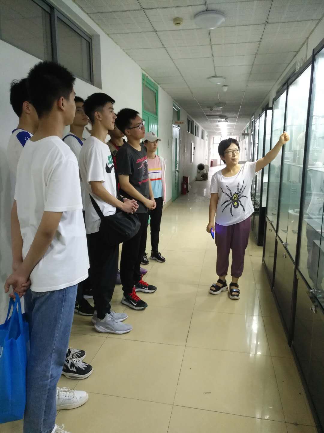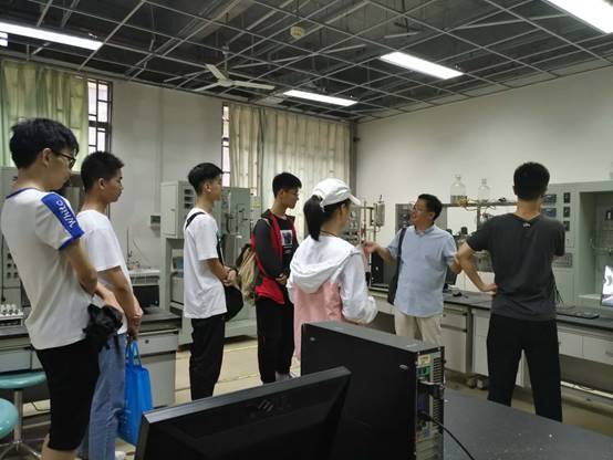 同学们参观了实验教学中心走廊的展示柜和化工实验室。李庆华、张永娜与李建通以诙谐幽默的话语深入浅出、生动形象地向同学们讲解了化工实验、物理化学实验和材料实验,老师们的专业知识与专业精神激发了他们对化学基础学科的兴趣,不停的询问和探讨,直至6点才恋恋不舍的离开。