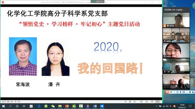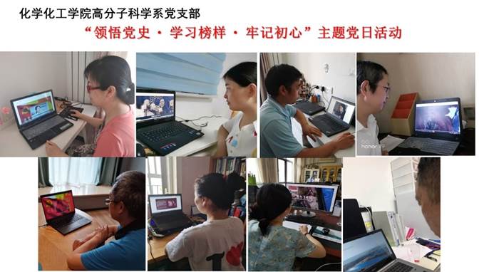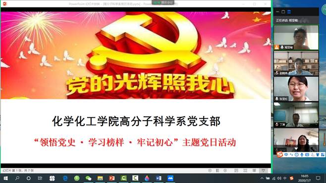 为了庆祝建党99周年,贯彻落实必赢242net官网和化学化工公司党委的要求,高分子科学系党支部于7月7日采取线上活动的方式,深入开展了“领悟党史 – 学习榜样 – 牢记初心”主题党日活动,公司党委委员、副经理张磊和高分子科学系全体党员同志参加。