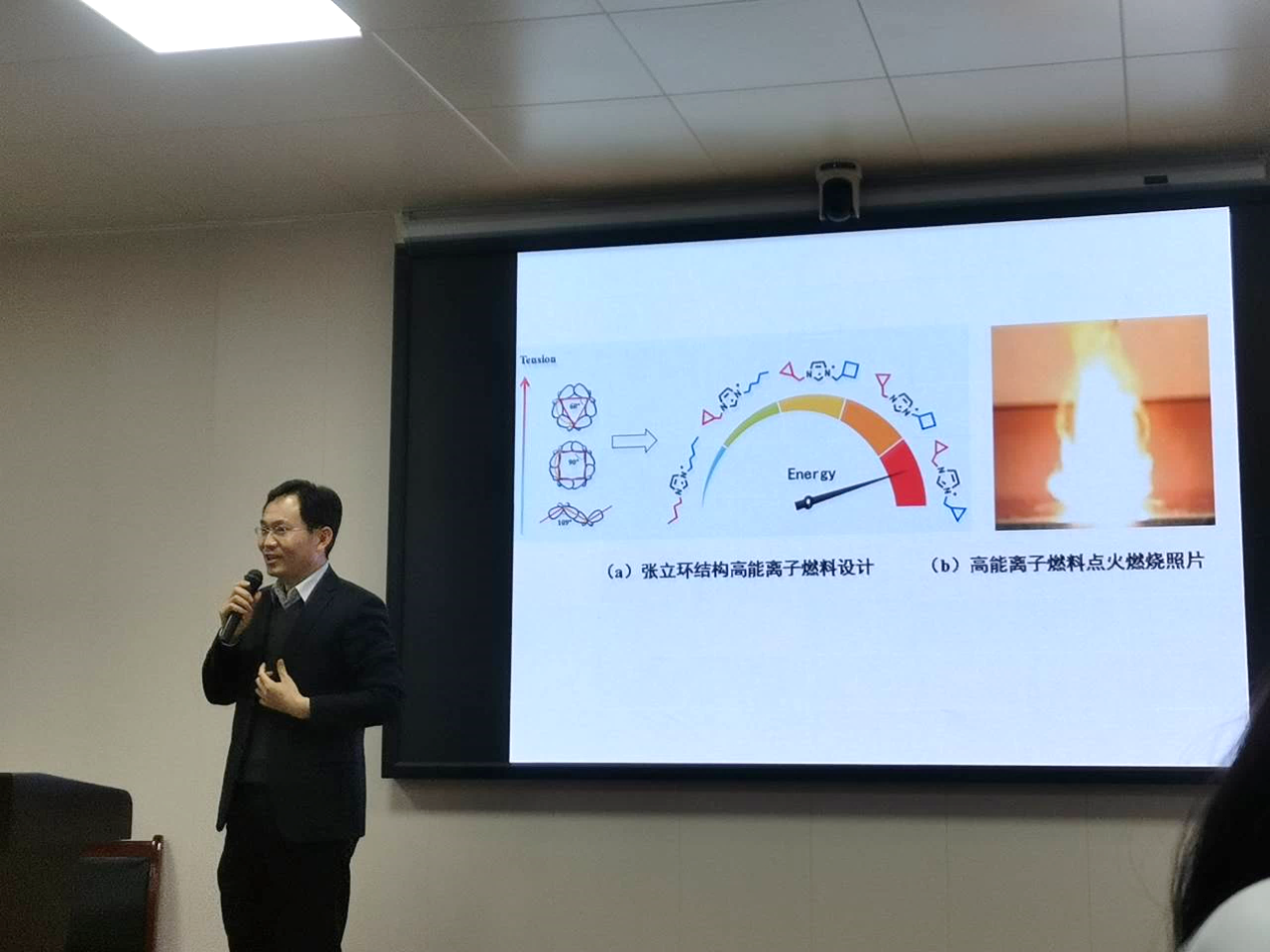 在第二场报告中,张延强研究员则通过对离子液体在航天工业上应用的讲解引入了离子液体的概念,详细地说明了离子液体高能燃料的应用。高能离子具有能量大、不挥发等优点,不仅能够满足火箭进入太空的能量需要,且其不挥发的性质保证了高精度运行和作业的安全性。随后张延强研究员讲述自己的科研经历,以此启发同学们,致力科研的员工要让用知识点缀人生,让科研融入理想。张延强研究员的讲述如化雨春风,给了同学们很大的启示作用。