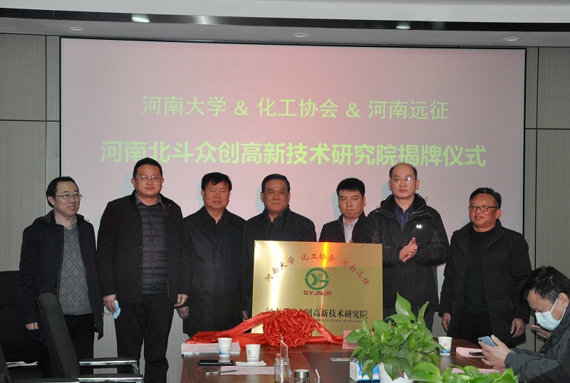 化学化工公司党委书记翟新礼、市工信局副局长王坤杰、科技局副局长赵振宪、会长王福贞共同为北斗高新技术研究院揭牌。
