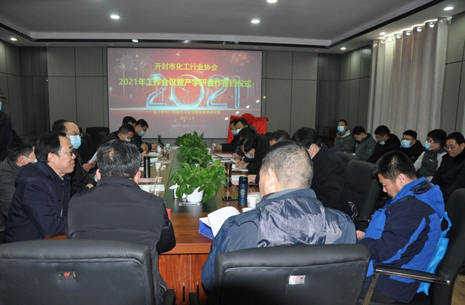 新年伊始,开封市化工行业协会年会暨产学研合作签约仪式在河南北斗高新技术研究院举行,开封市工信局副局长王坤杰、科技局副局长赵振宪、公司科学技术研究院副经理李谦、化学化工公司党委书记翟新礼、副经理徐元清以及来自企业的代表近50人出席签约仪式。仪式由行业协会常务副会长、化学化工学院经理助理许英教授主持。