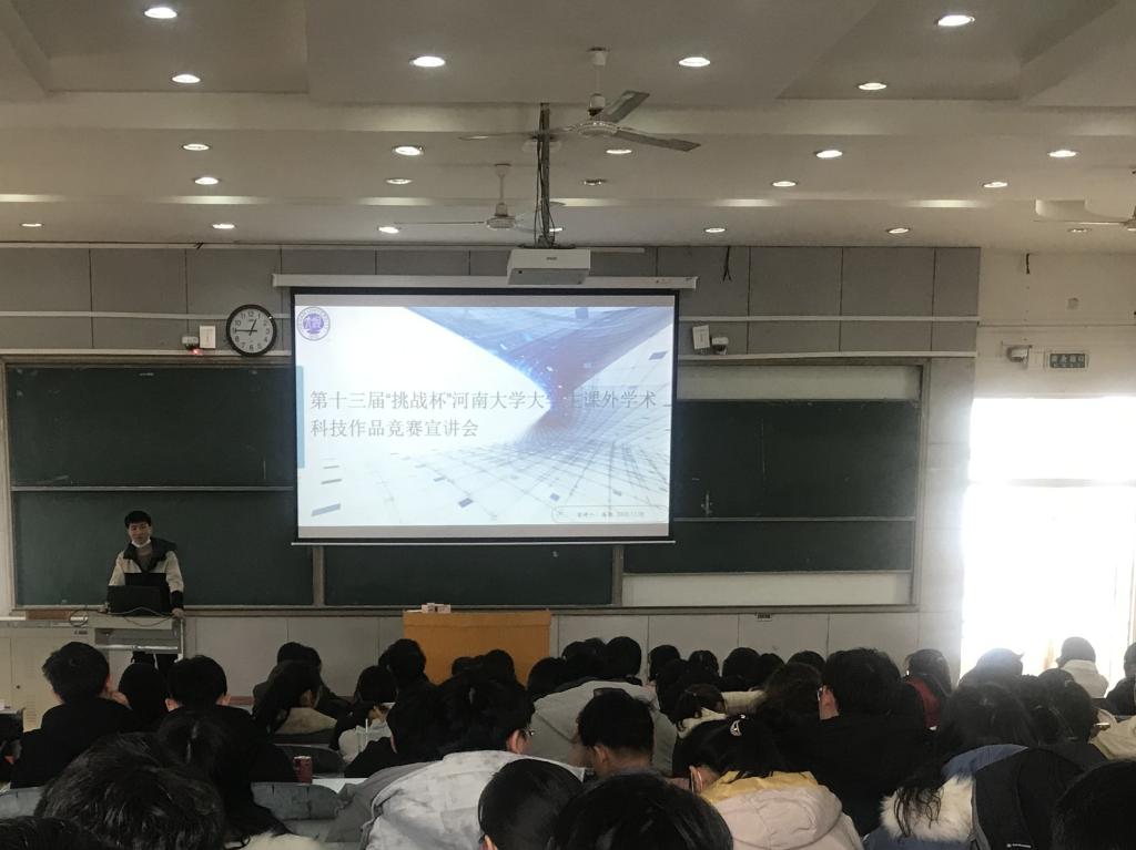 海傲同学曾在第十二届及第十四届'挑战杯”课外学术科技竞赛中分别荣获校级二等奖以及省级三等奖。此次宣讲会中,他结合自身的经验将赛前准备工作分为:确定选题、组队分工、作品创作、修改完善四大类。其中,海傲着重强调了团队分工的重要性。不仅如此,海傲还通过一些生动形象的比喻将比赛的小技巧、小妙招分享给大家,并展示自己的作品,使同学们对比赛有更加清楚的了解和认识。在互动环节同学们积极提出自己的问题,有关于选题的、有关于比赛周期的等等,海傲认真的一一解答。在宣讲会将要结束时,海傲用“取乎其上,得乎其中。取乎其中,得乎其下。取乎其下,则无所得也。”来告诫大家要认真对待这次比赛。