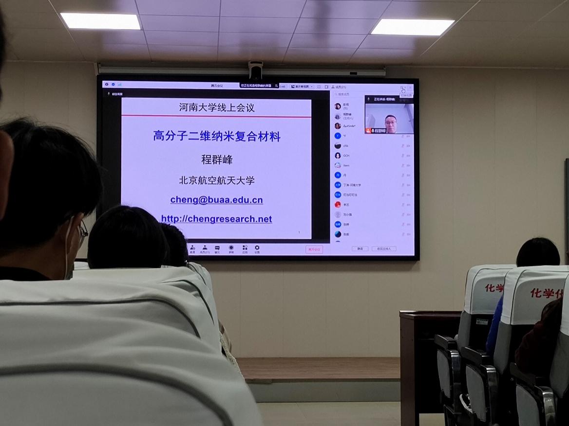 11月17日上午,应化学化工学院邀请, 公司1999级员工、国家杰出青年基金获得者、北京航空航天大学化学学院副经理程群峰教授做了一场题为“高分子二维纳米复合材料”的网络报告。化学化工学院教师和研究生近百人在226会议室聆听了报告。会议由副经理徐元清主持。