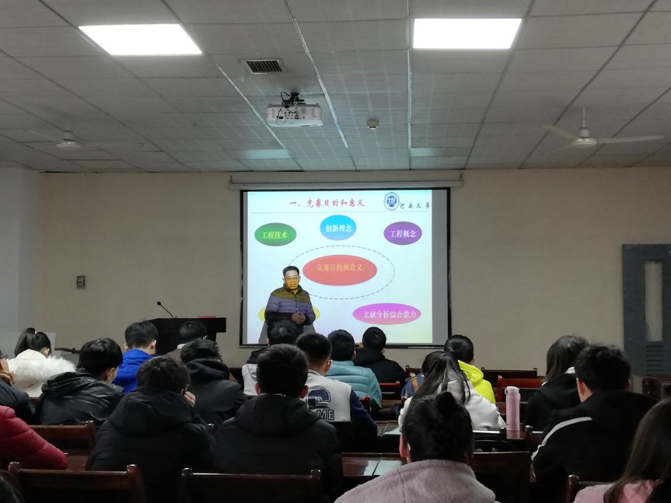 首先,李庆华对国内化工产业形势做出简明扼要的概述与分析。他以部分化工产业造成的污染现状为着手点,顺理成章地阐明发展绿色化学的重要性及开展化工设计竞赛的必要性。之后李庆华从创新理念、项目设计、工程技术、工程概念等方面展开了系统的介绍,鼓励参赛队伍开拓发散性思维,应用创新性知识,其中,项目可行性研究报告的编撰过程与饺子制作过程的巧妙类比与结合使在场同学更为深刻清晰地了解了相关事宜。最后,他深入详细地讲解化工产业链及相关流程图,使同学们明确了化工流程图的设计与制作过程。