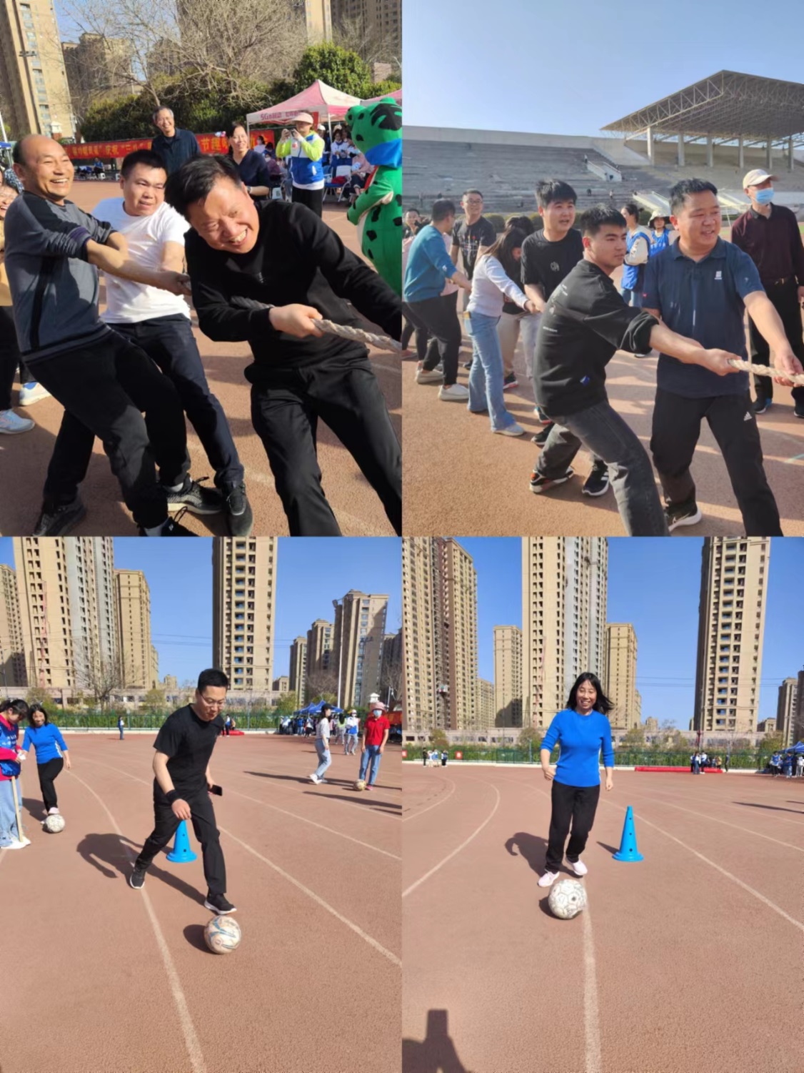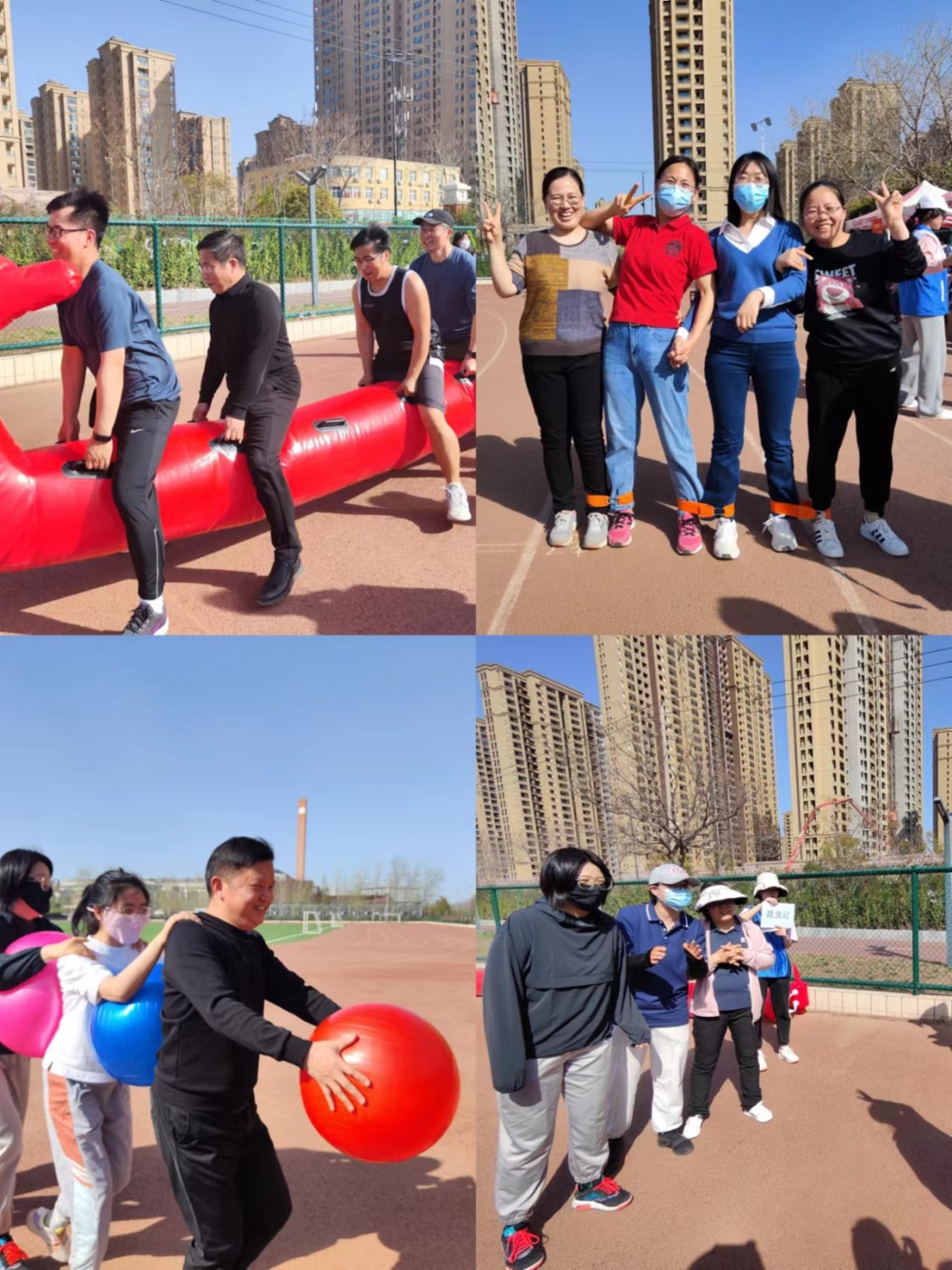 动作模拟赛场,你来表演我来猜,表演的老师使劲浑身解数,绞尽脑汁表现出词语的意思,答题的老师聚精会神、头脑风暴,迅速做出反应,比赛现场紧张刺激、精彩纷呈,引来阵阵赞叹。沙包攻防赛场的老师们则是灵动跳跃,眼观六路、耳听八方,时刻提防着沙包的攻击,大家斗智斗勇,一片欢腾。欢乐背夹球的老师们排成一列,中间以瑜伽球相隔,像毛毛虫一样前行,憨态可掬,“笑”果十足。四人五足跑的队员们团结一心、合作默契、手臂相挽、口号嘹亮、步伐一致,冲向终点。旱地龙舟比赛最为辛苦,老师们骑在道具龙舟上,十余人手握把手同时前行,摇摇摆摆、险象环生,观众的心情也跟着跌宕起伏。带球绕杆接力现场更是笑声连绵,有时人追着球跑,有时球随着人行,速度和精度难以兼得,大家乐得直不起腰来。一元五角则是老师们根据主持人报数随机组合,烧脑拼速度,现场乱中有序,“抢人”大战激烈刺激。最后的拔河比赛,更是精彩纷呈,各队纷出奇招,锁链战术、下蹲战术、搞笑头像战术层出不穷,让人捧腹不已。趣味运动会赛场真正是妙趣横生、笑声爽朗、心情飞扬。暖暖的阳光、晶莹的汗珠、飞扬的心情,让全体老师在这个难忘的周四下午放松了身心,健康了体魄,以更加积极饱满的状态投身到学院和学校的发展新征程中。