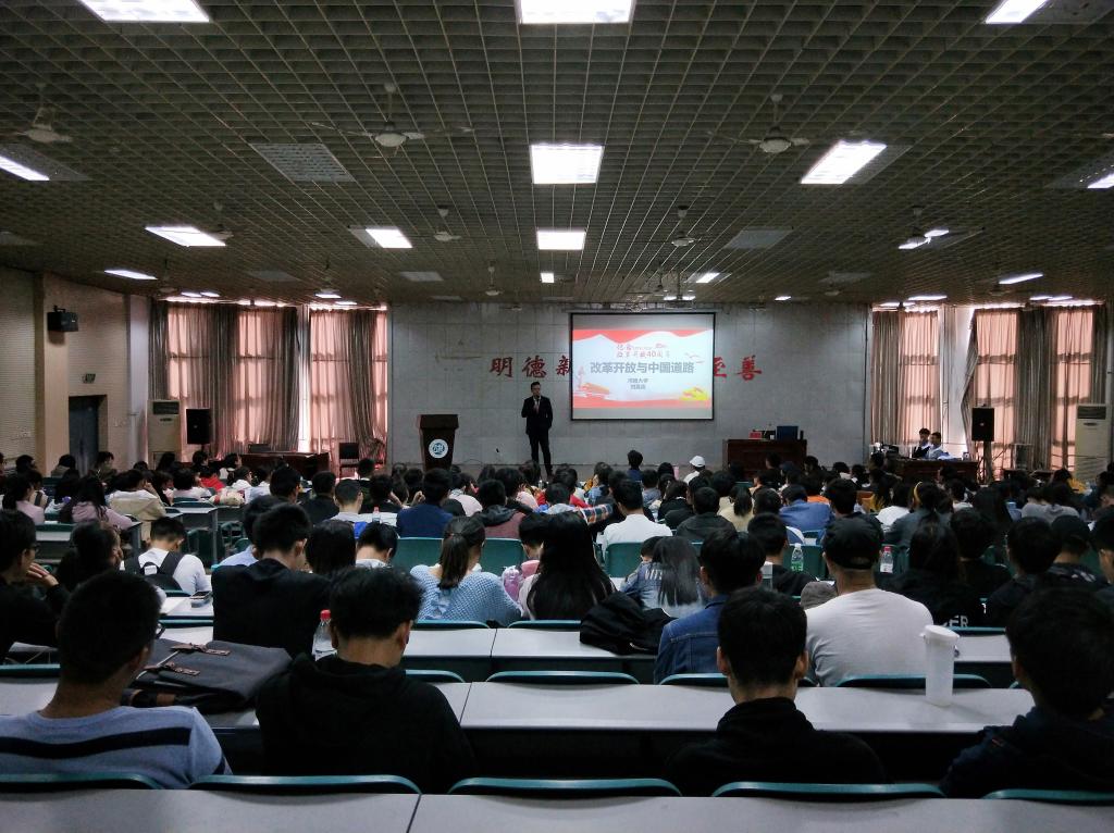 刘嘉尧首先做了简短的自我介绍,接着从改革开放是决定当代中国命运的正确之路、改革开放40年中国特色社会主义的成就之路、改革开放40年中国特色社会主义的理论之路、新时代展望中国特色社会主义的发展之路四个方面展开讲解。他用生动幽默的语言讲述了小岗村故事、撒切尔夫人访华、香港回归等历史故事,激起大家的兴趣,让同学们在笑声中加深对党史国情的学习。最后刘嘉尧又进一步阐述了两个一百年与为实现第二个一百年的两步走战略,“在中国共产党领导下,中国人民凭着一股逢山开路、遇水架桥的闯劲,凭着一股滴水穿石的韧劲,成功走出一条中国特色社会主义道路。我们遇到过困难,我们遇到过挑战,但我们不懈奋斗、与时俱进,用勤劳、勇敢、智慧书写着当代中国发展进步的故事。”此次报告会以习近平总书记的这段话为终点,圆满落幕。